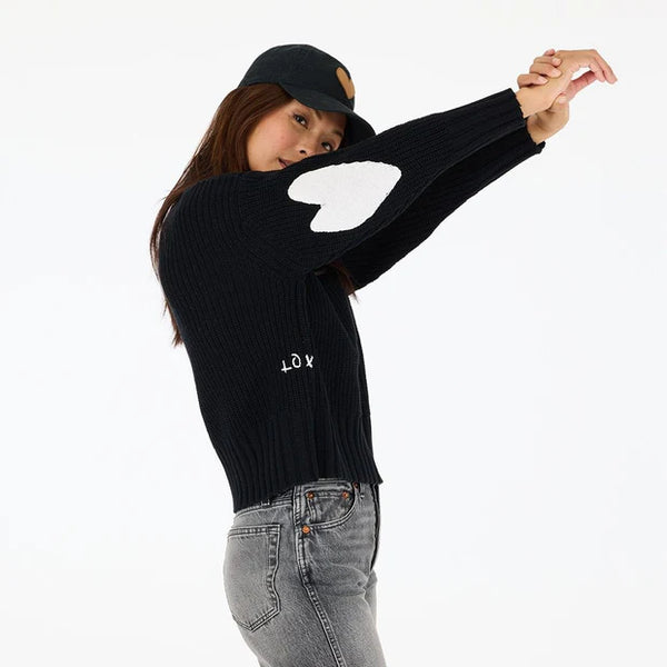 Inspired by timeless fisherman styles, the Marlow Imperfect Heart sweater is a is a rib-knit mock-neck in soft black cotton. It has heart appliqué elbows and loved embroidered on the waistline. The dropped shoulders create a relaxed fit.